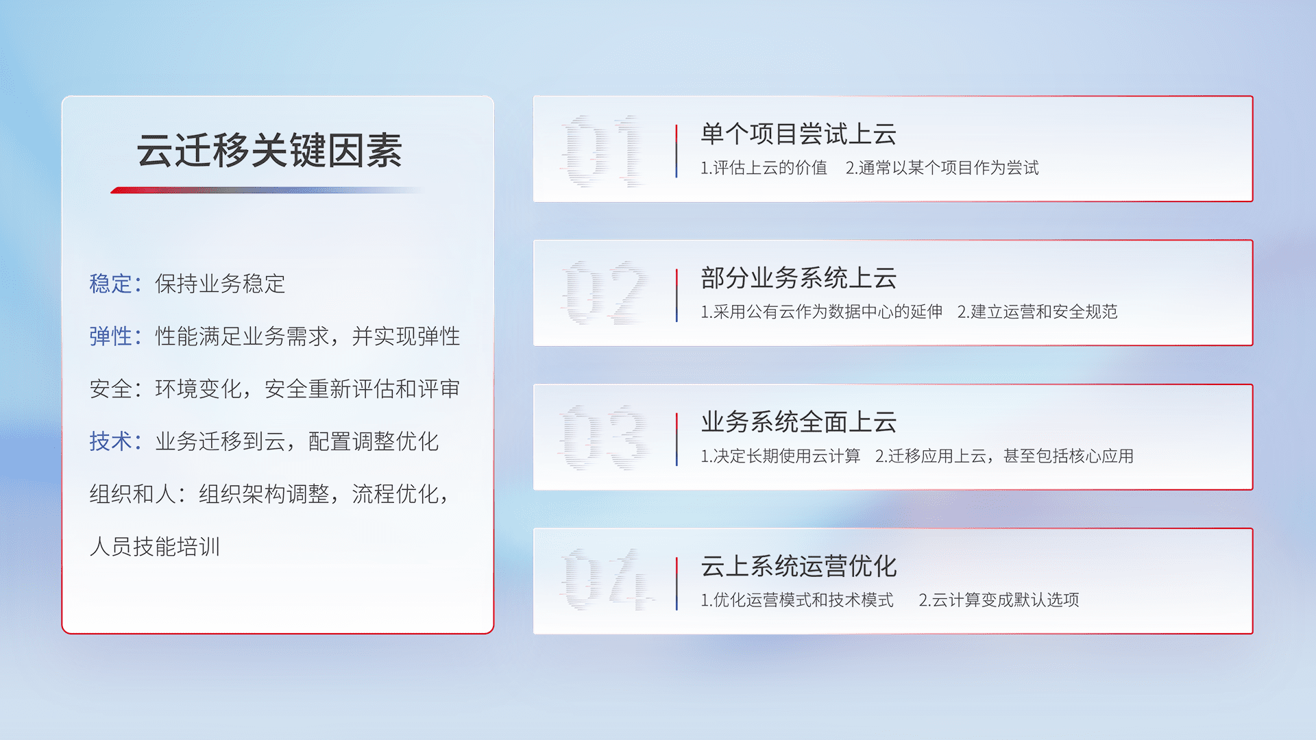 结合实际业务,,,从规划设计、、云平台选型、、、、云原生改造、、、数据迁移、、、、集成交付,,迁移全过程为客户识别最佳上云路径,,做好风险识别管理,,,,设计网络架构、、、、身份权限、、、、安全审计合规、、、操作审计、、、日志审计、、、监控告警策略、、、、多站点容灾设计等,,对云上基础设施进行整体规划,,,提升IT治理水平,,,,以满足弹性、、高可用、、高性能的需求。。。