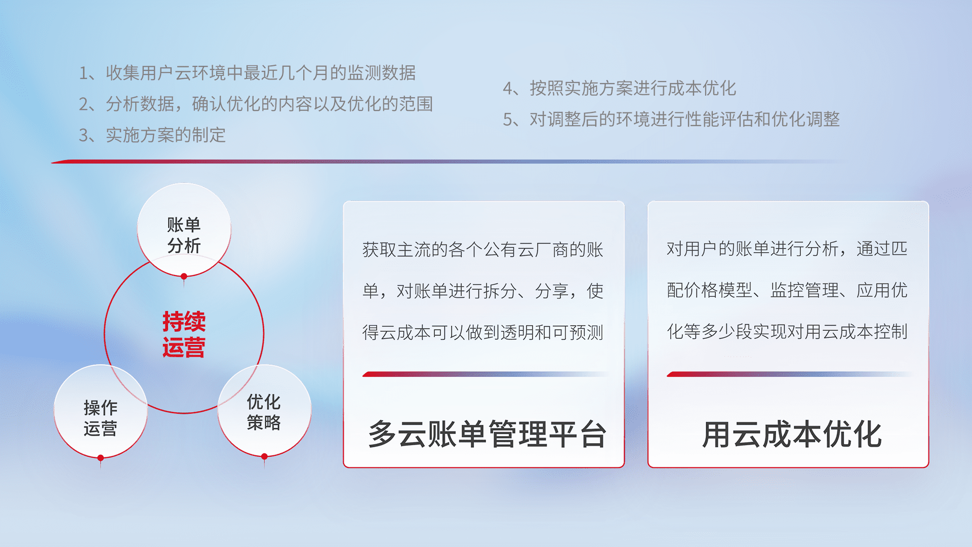 通过多云纳管,,以统一的资源数据模型把客户的云资源进行抽象和封装,,,进而实现对多云资源的统一操作,,,保障云资源管理的可靠性、、、稳定性与可用性。。。。量身定制化运维内容,,,配置、、开发运维、、、补丁管理、、备份、、监控、、认证和访问管理、、、审计和日常巡检等,,,保障在用云过程中的可靠度,,稳定度以及高可用率。。。。